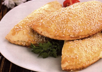 un aluat moale. Presari cu făină scândura de aluat şi împărţi aluatul în 10 „mingi”. Din fiecare „minge” întinzi o foaie cu grosime de 1 cm. Cu un pahar decupezi cercuri de aluat şi pui în centrul fiecărui cerc umplutură, apoi îndoi, lipind marginile.