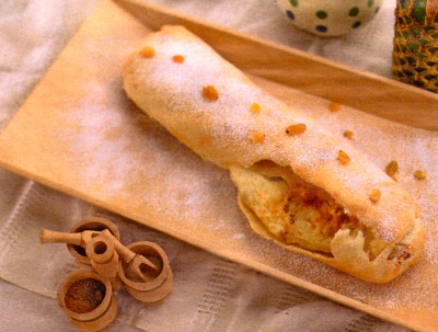 Razi brânza într-un castron, o amesteci bine cu ouă, stafide, zahăr şi coajă de lămâie. Stropeşti cu unt foaia de aluat întinsă, apoi adaugi un strat uniform de brânză, după care o rulezi în forma unui sul. Ungi tava cu unt şi o tapetezi cu făină, apoi aşezi sulul în ea. Dai la cuptor 30 de minute. Serveşti rulada caldă sau rece, presărată cu zahăr pudră şi, eventual, stafide.