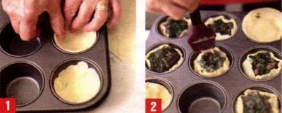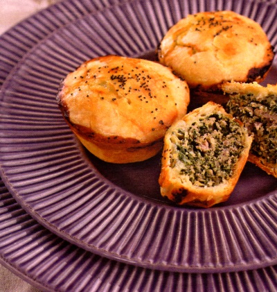 cu oul, condimentele şi adaugi amestecul în carnea tocată, întinzi o foaie de aluat şi tai cu cana 12 cercuri, pe care le pui în formele de brioşe unse. Umpli cu câte o lingură de umplutură. Tai tot cu cana 12 căpăcele şi acoperi formele de brioşe, sigilând marginile cu ou bătut. Ungi, de asemenea, cu ou bătut, presari mac şi le dai la cuptor la foc potrivit, circa 30 de minute.