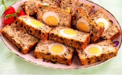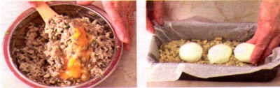 Toci ceapa şi o înăbuşi în câteva linguri de ulei. Adaugi ciupercile tăiate foarte mărunt şi carnea tocată şi amesteci, adăugând muştarul şi câteva linguri de apă. Presari apoi condimentele şi amesteci bine. Opreşti focul, laşi la răcit tocătura, adaugi mărarul tocat mărunt şi cele două ouă crude, amestecând totul foarte bine. împărţi compoziţia în două şi pregăteşti două forme de chec. lei o tavă de chec şi o tapetezi cu hârtie de copt. Pui un strat de tocătură, apoi aşezi 3 ouă fierte şi le acoperi cu restul de carne. Repeţi operaţia şi cu cealaltă tavă, după care introduci tăvile în cuptorul încins, pentru o oră. Scoţi tăvile şi presari deasupra caşcaval ras şi le mai laşi în cuptor pentru 3-5 minute.