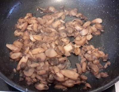 Încingi uleiul într-o tigaie adâncă de tip wok și călești ciupercile timp de 2 minute.