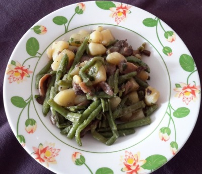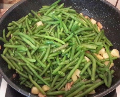 Adaugi fasolea verde, cartofii și concentratul de pui deshidratat (mărunțit), amesteci totul și lași la foc mic timp de 8 minute.