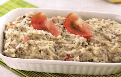 Coci vinetele, le cureţi de coajă şi le laşi la scurs, apoi le toci. Tai roşiile mărunt. Amesteci şi pui uleiul, amestecând continuu, până când se încorporează. Cureţi ceapa, o toci mărunt şi mixezi energic cu puţină sare şi ulei, circa 3 minute. Adaugi ceapa curăţată şi tocată mărunt şi potriveşti gustul de sare. în timpul tocării vinetelor pe un suport, adaugi ciupercile gratinate, pătrunjelul tăiat mărunt, roşiile, uleiul, boia dulce de ardei, maioneza, ghimbirul şi sare după gust. Dacă alegi să faci maioneză în casă, pui într-un vas curat
