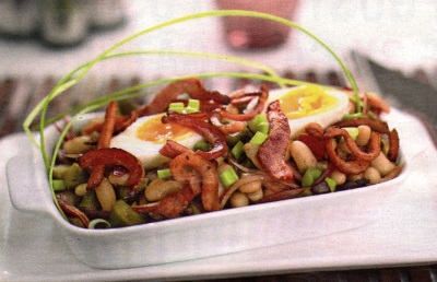 Fierbi fasolea din timp cu legumele care se potrivesc (morcovi, ţelină, ceapă, usturoi, dafin). Strecori apoi şi fie foloseşti totul pentru o salată de moment, fie congelezi pentru preparate viitoare. Tai ceapa roşie peştişori, sărezi, condimentezi cu seminţe de coriandru proaspăt pisat şi torni deasupra oţetul balsamic. Laşi o jumătate de oră să-şi lase zeama şi să se aromatizeze. Şunca afumată (sau baconul) o tai fideluţă şi o prăjeşti până devine crocantă. Scurgi untura lăsată şi aşterni bucăţile de bacon pe şervete de bucătărie, până se răcesc şi-şi lasă grăsimea. Tai cuburi castraveţii şi gogoşarii acri. Amesteci fasolea strecurată şi încă fierbinte cu sarea, uleiul şi oţetul din vin roşu. Când se răceşte, adaugi acriturile, ceapa balsamică şi amesteci. Adaugi deasupra bucăţile de bacon crocant şi ouăle tăiate în jumătăţi. Piperezi şi presari ceapa verde tăiată mărunt.
