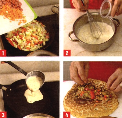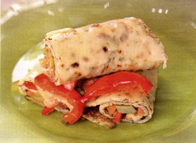 Prepari clătitele ca în reţeta de bază, adăugând Ingredientele enumerate. Umpli clătitele cu amestecul de legume şi le împătureşti. Ungi o tavă cu puţin unt şi presari pesmet. Aşezi clătitele în tavă, pui deasupra câte o felie de caşcaval subţire şi o rondea de ardei gras. Dai totul la cuptor, pentru 10-15 minute.