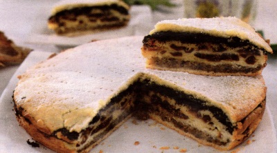 Freci ouăle cu untul moale, adaugi zahărul, puţină sare, laptele în care ai dizolvat drojdia, coaja rasă de lămâie, apoi făina. Umplutura este bine să o prepari cu 3 ore înaintede a frământa aluatul. Smochinele şi curmalele le tai în bucăţi mici. Opăreşti macul, îl strecori, îl pisezi şi îl amesteci cu zahărul pudră şi cu smântână. Dai nucile prin maşina de tocat şi le amesteci cu albuşul bătut spumă. Scurgi dulceaţa de portocale de zeamă. împărţi coca în 5 bucăţi şi o întinzi pe o masă mare unsă cu unt. Ungi fiecare foaie cu câte o umplutură, alternând cu câte o foaie de cocă şi cubuleţe de coajă de portocală. La sfârşit, înţepi cu o furculiţă din loc în loc, pentru a pătrunde aerul. Dai tava la foc mic. Când e copt tortul, îl presari cu zahăr pudră.