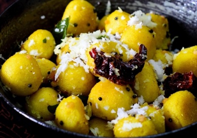 3 Se fierbe apă în altă oală. Cu ajutorul a două linguri, din compoziţia de mălai se modelează găluşte care se fierb, în tranşe, în apă. Se lasă 5-6 minute, până când se ridică la suprafaţă, apoi se scot cu o spumieră şi se menţin calde.