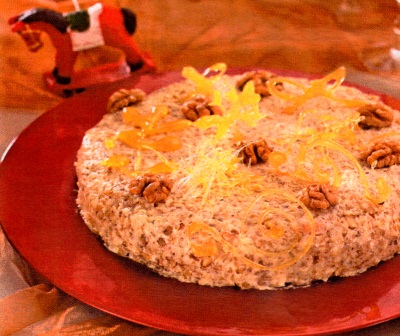 Ungi întâi o formă de tort cu unt, aşterni pe fundul ei o hârtie albă tăiată după mărimea formei care, de asemenea, trebuie unsă cu unt. Freci apoi gălbenuşurile cu zahărul brun, până se măreşte volumul şi obţii o cremă. Adaugi nucile măcinate, coaja rasă de lămâie, făina, pesmetul şi, la urmă, albuşurile bătute spumă tare cu puţină sare, amestecându-le uşor. Torni compoziţia în forma unsă şi coci la foc potrivit aproape o oră. încerci blatul, înfigând un pai; dacă acesta iese curat, blatui este gata. Laşi să se răcorească, îi răstorni pe un fund de lemn curat, desprinzi uşor hârtia şi răstorni din nou pe o farfurie. Când blatul s-a răcit, îl tai în trei foi.