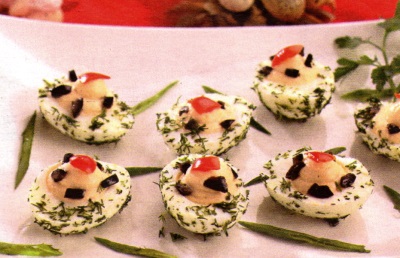 Fierbi ouăle 10 minute (gălbenuşul trebuie să fie tare), le cureţi şi le tai în jumătăţi. Scoţi gălbenuşurile. Intr-un bol amesteci gălbenuşurile, maioneza, smântână, crema de brânză, piper, zeamă de lămâie, muştarul şi mărarul tocat mărunt, până obţii o cremă. Cu această cremă umpli jumătăţile de ou şi, pe fiecare, aşezi câte o jumătate de roşie cherry. Aranjezi ouăle pe un platou, ornate cu pătrunjel, fire de ceapă verde şi măsline.