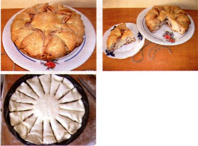 Umplutura o faci din dulceaţa de zmeură, esenţa de vanilie, nucile tocate şi 2 linguri de unt topit sau margarină. Laşi aluatul la crescut, după care îl împărţi în 4 bile, din care întinzi 4 foi. lei o formă rotundă, o ungi cu ulei şi aşezi foile alternând cu umplutura. Formezi apoi o floare din 12 petale. în mijlocul tartei delimitezi un cerc, după care pe margini îl împărţi în 12 părţi egale. Cu ambele mâini iei câte două petale şi le răsuceşti în direcţii diferite, formând la final o stea în mijloc. La sfârşit ungi cu unt sau margarină şi presari seminţe de susan şi zahăr tos. Mai laşi la crescut, după care dai tava la cuptor Când este gata, scoţi tarta, o mai ungi o dată cu unt (margarină) pentru catifelare, luciu şi culoare. O feliezi doar după răcire. Poţi folosi orice dulceaţă doreşti. Pentru un aluat pufos, trebuie să ai răbdare să crească înainte de a-l introduce în cuptor.