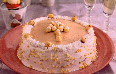 Apoi întinzi deasupra restul de cremă şi pui din nou tortul la rece pentru o oră. Prăjeşti alunele în-tr-o tigaie fără grăsime, laşi să se răcească, apoi le toci mărunt. Baţi restul de smântână, întinzi frişca obţinută peste tort şi presari deasupra alunele.