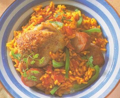 5 Se taie cârnatul felii şi se adaugă, împreună cu ardeiul gras, la orez. Se amestecă şi se mai fierbe totul 5 minute. Se ornează Paella cu pătrunjel şi se serveşte.