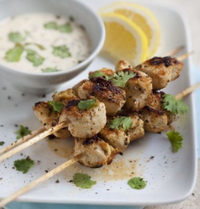 Așezi bucățile de pui pe bețișoarele pentru frigărui.