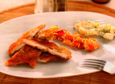 Serveşti şniţelul cu salata de cartofi şi legumele mexicane, iar după, gust poţi servi şi iaurt (ca acompaniament).