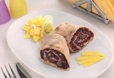 Frămânţi un aluat din făină, o linguriţă de sare, 125 ml apă călduţă, 2 linguri de. ulei de măsline şi oul întreg. Acoperi cu un şervet şi laşi să stea circa 1 oră la temperatura camerei. încingi cuptorul la 180 de grade. Cureţi sfecla de coajă şi o dai pe răză-toarea mare. Varza roşie curăţată o tai mărunt, iar ardeiul iute (fără nervuri şi seminţe) îl tai rondele. Tai smochinele cubuleţe şi miezul de nucă îl tai grosier. încingi într-o tigaie 2 linguri de ulei de măsline şi dunstuieşti în el toate legumele şi fructele. întinzi aluşitul de ştrudel cât mai subţire, pe un ştergar presărat cu făină. Repartizezi zi umplutura peste aluat, pliezi marginile şi rulezi apoi aluatul strâns, cu ajutorul ştergarului.