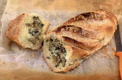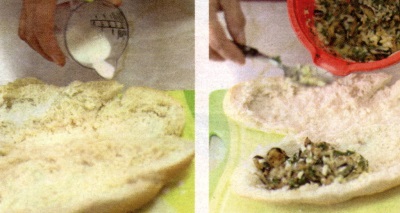 Le prăjeşti la foc moderat şi le laşi la răcit. Tai pâinea în două pe orizontală şi scoţi miezul. Cele două „capace” le stropeşti cu lapte, până se înmoaie. Baţi cele două ouă, le amesteci cu caşcavalul, cu laptele rămas, cu vinetele, verdeaţa tocată şi condimente. între cele două capace pui umplutura. Introduci pâinea pusăîntr-o tavă, în cuptor la foc potrivit. Este gata atunci când pâinea este uşor rumenită.